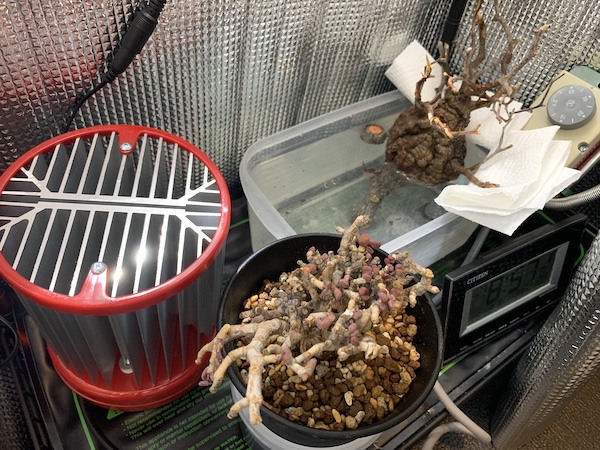 温室内の温度はこのとき30℃以上ありました。というのも、このタイミングでパキプスの発根管理もしていたので・・・