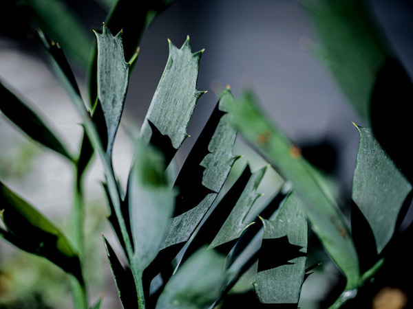 葉は狭長で尖り、鋸歯状の刃があります。葉の配置は放射状に広がり、葉先がカールした姿は非常に魅力的です。