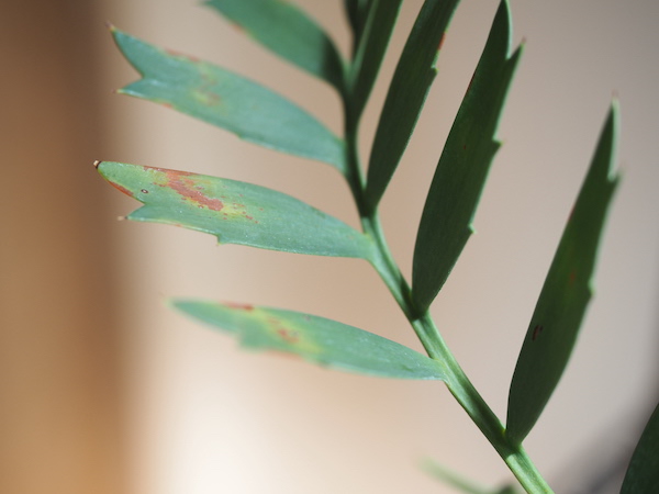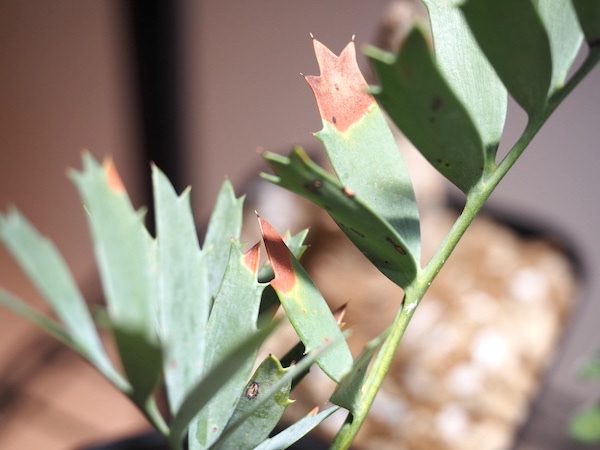 今回、エンセファラルトス・ホリダスが薬害の影響を受け、葉が変色してしまいました。